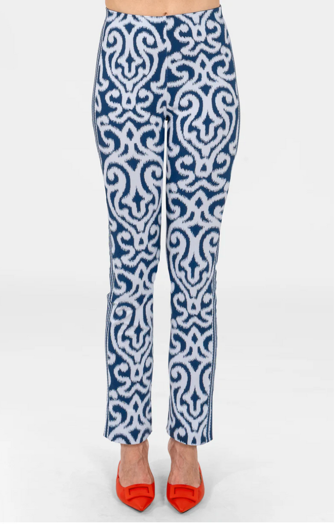 Effortless and flattering, these gripeless pull-on pants combine comfort with standout design. While the allover arabesque pattern makes a statement on its own, the contrasting side band adds a polished, sporty-chic touch that elongates the leg and gives these pants an extra pop. A contrast-colored elasticized interior waistband keeps the fit smooth and comfortable, while subtle back ankle slits add ease and movement.