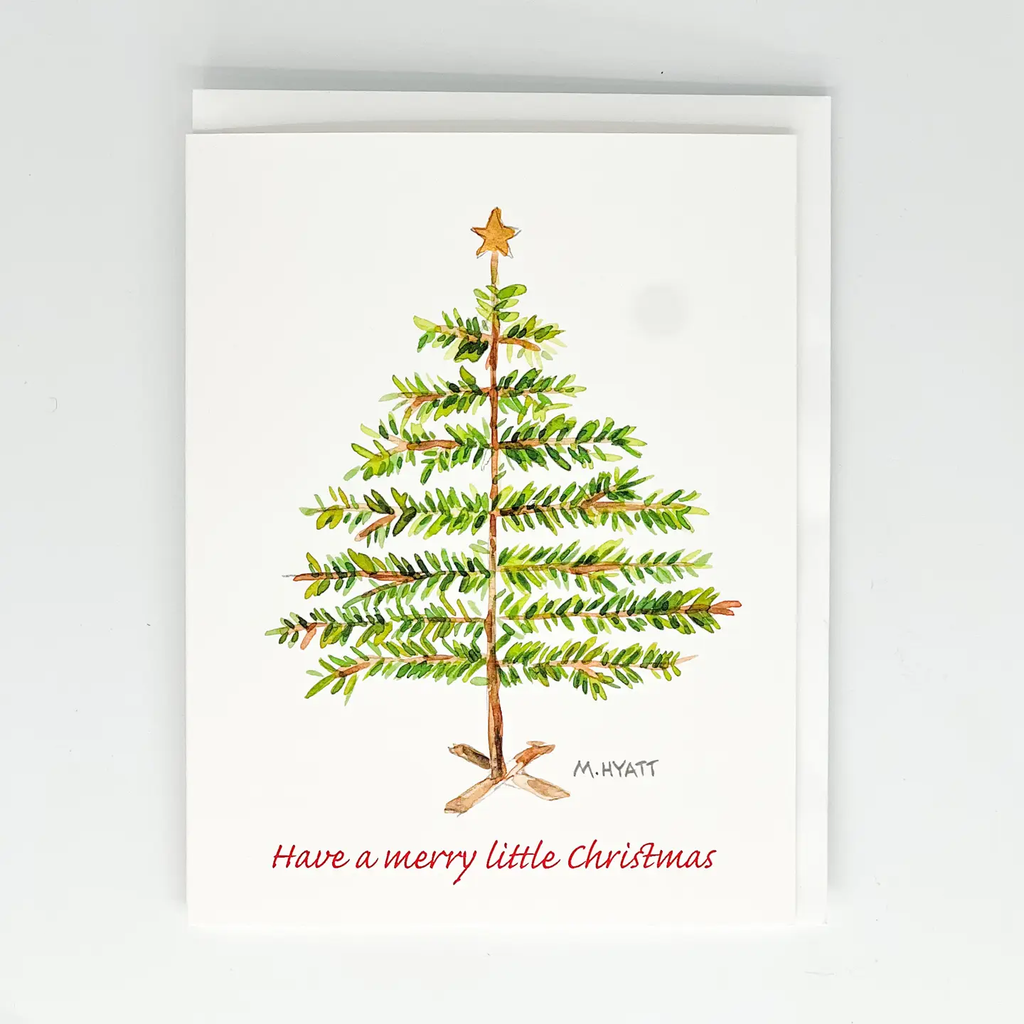 "Have a merry little Christmas "is written in red below a simple sweet tree with. a tiny gold star on top. Classic and festive in it's simplicity perfect for Holiday card writing. A great Hostess gift, Thank you gift or stocking stuffer! Front of card reads Merry Christmas! The cards are printed in the USA on a luxurious folded card stock. They are blank inside, perfect for writing a note or greeting. The face has a beautiful matte finish and is packaged in a kraft box with a clear window