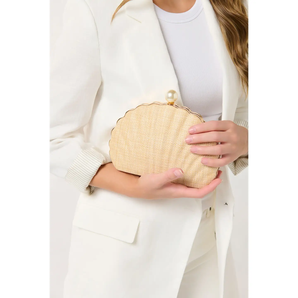 Elevate your evening look with the Navy Ariel Minaudière, a beautifully structured evening clutch that blends timeless elegance with modern coastal style. The rich navy textured fabric is complemented by delicate scalloped edges and a chic pearl clasp closure, creating a sophisticated statement piece perfect for special occasions.