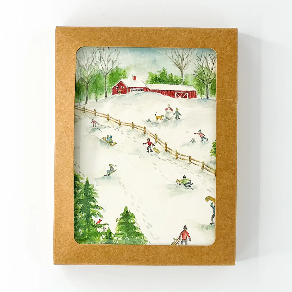 Melissa grew up in Northern Connecticut. She created a series of Winter scenes depicting her fond memories of those days. This one features sledding, snowmen, kids and a dog! She and her brothers went sledding for hours through the woods of her childhood home, so fun! The cards are printed in the USA on a luxurious folded card stock. They are blank inside, perfect for writing a note or greeting. The face has a beautiful matte finish and is packaged in a kraft box with a clear window