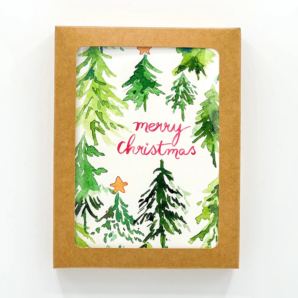 Merry Christmas is Hand lettered in red amidst a forest of evergreens and stars. Playful and cheery and perfect for Holiday card writing. A great Hostess gift, Thank you gift or stoking stuffer!