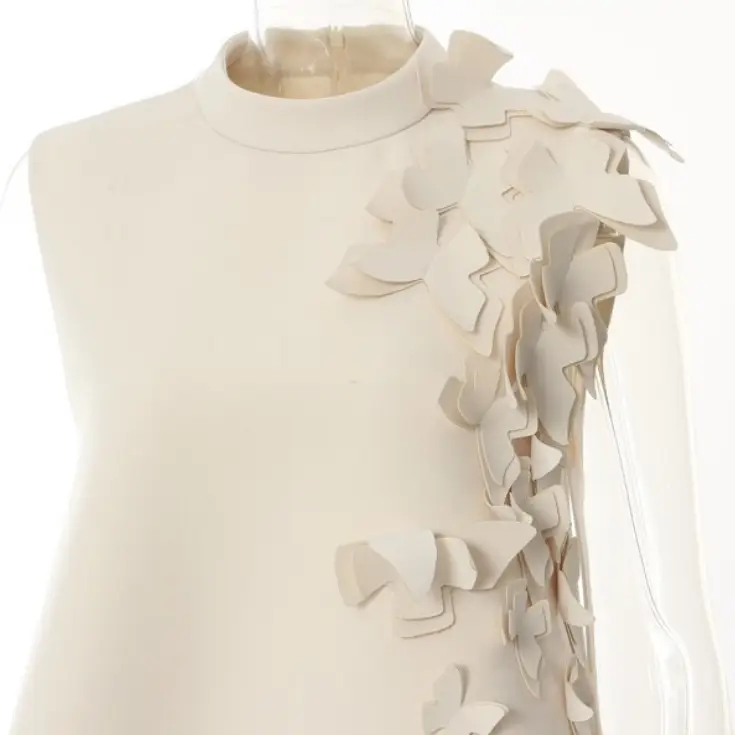 Embrace sculptural elegance with this sleeveless party dress, designed in a soft neutral tone and elevated by cascading butterfly-shaped appliqués along the shoulder and bodice. The asymmetrical detailing adds depth and movement, creating a look that feels both whimsical and refined. Crafted from smooth, structured fabric, the high neckline and flattering A-line silhouette offer a modern, minimalist balance while beautifully shaping the figure.