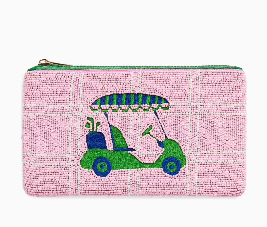 Playful and polished, this hand-beaded zip pouch adds a fun pop of personality to your everyday essentials. Featuring a charming golf cart motif set against a soft pink beaded background, it’s the perfect size for stashing makeup, cards, or small necessities. Finished with a secure top zip closure and a handy interior slip pocket for easy organization.