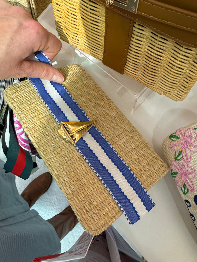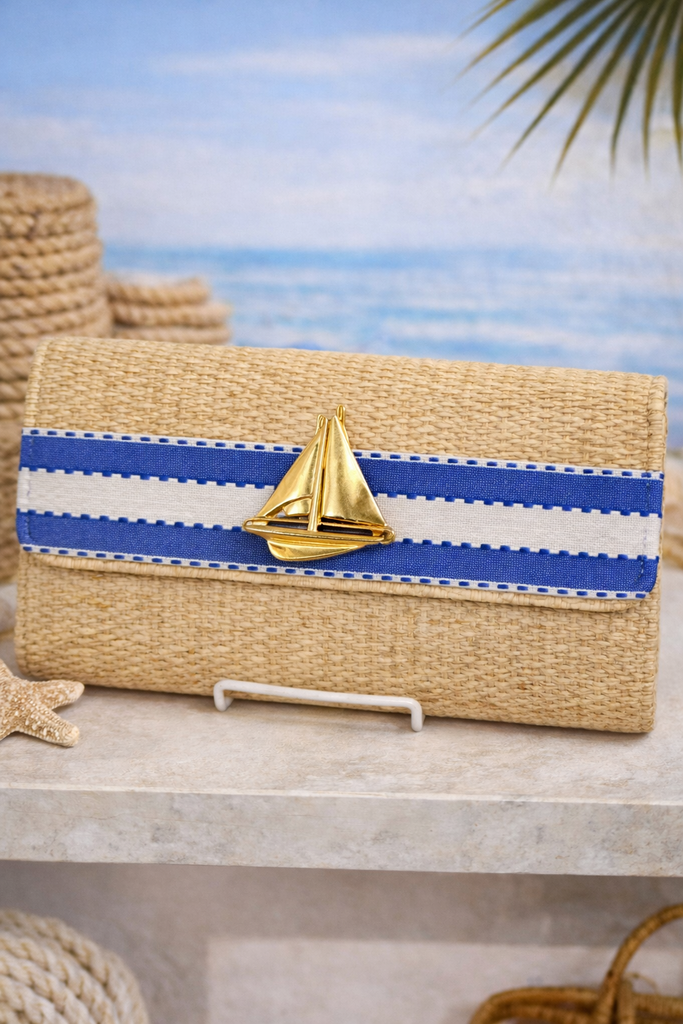 The Straw Ruby Clutch blends classic coastal charm with bold nautical detail. Handwoven from natural straw, this structured silhouette features a blue and white dash ribbon band and a sculptural gold sailboat accent for a crisp, maritime-inspired statement.
