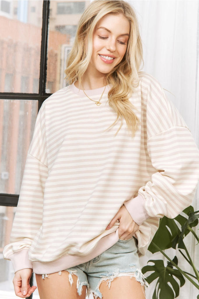 A timeless take on your favorite casual layer. This beige and white striped pullover features a classic nautical-inspired print with contrast ribbed trim at the neckline, sleeves, and hem. With its loose, relaxed fit, it’s easy to throw on for a polished yet effortless look—perfect for everyday wear, lounging, or layering.