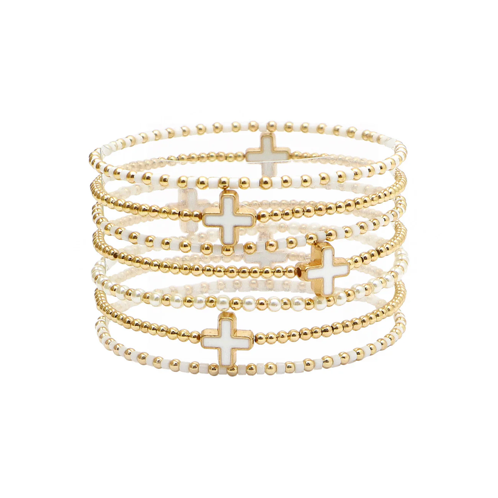 The Irina White Bracelet is an easy, elegant layering piece you’ll reach for again and again. Designed with multiple delicate strands of gold-tone and white beads, each strand is finished with a glossy white cross accent for a look that’s both meaningful and timeless.