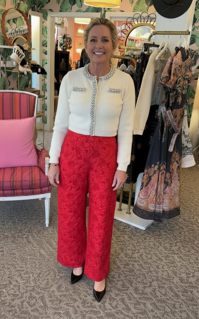 Elevate your holiday wardrobe with the Arielle Jacquard Wide Leg Pants — a sleek, statement-making piece designed to turn heads. Cut in a flattering high-waist silhouette with a dramatic wide leg, these pants are crafted from richly textured jacquard for instant sophistication. Fully lined with an invisible side zipper for a smooth finish, they’re as polished as they are comfortable. Style them with a satin blouse and crystal drop earrings for an effortlessly chic evening look.