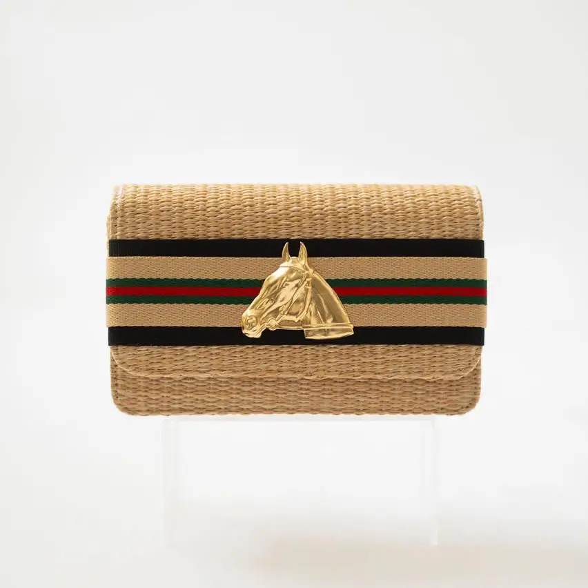 Elevate your look with the Ruby Straw Foldover Clutch featuring a gold horse-head accent and striped grosgrain detail. Perfect for equestrian events, brunch, or evenings out. Shop this chic woven clutch at Vivid Hue Home + Gifts in Farmington, CT.