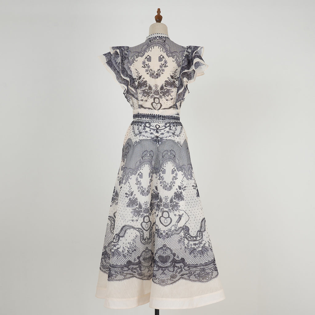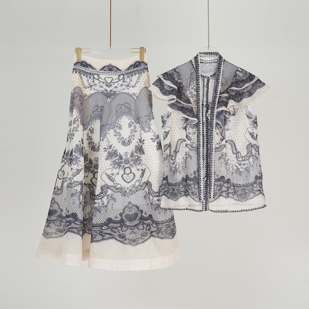 Effortlessly chic and timelessly feminine, this Ruffled Sleeveless Top & A-Line Maxi Skirt Set makes a sophisticated statement for any occasion. The sleeveless button-front top features a stand-up collar and delicate ruffled flutter sleeves, adding a touch of romance to its tailored silhouette.