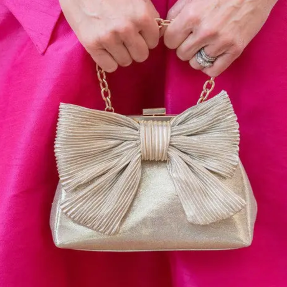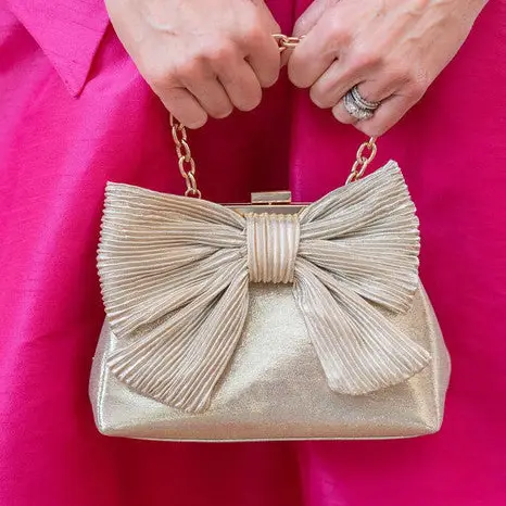 Add a touch of glamour to any outfit with the Samantha Bag, a chic statement piece designed to turn heads. Crafted in a luxurious metallic gold finish, this elegant clutch features an oversized pleated bow that exudes sophistication and playful charm.