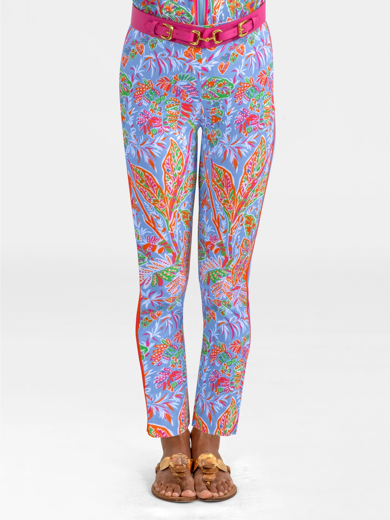 Fresh, feminine, and full of color — the Gripeless Pull-On Pants in Vintage Vines Periwinkle are a vibrant twist on a classic silhouette. Set against a soft periwinkle blue base, the lively botanical print in pink, coral, orange, and green makes this pair both playful and polished.