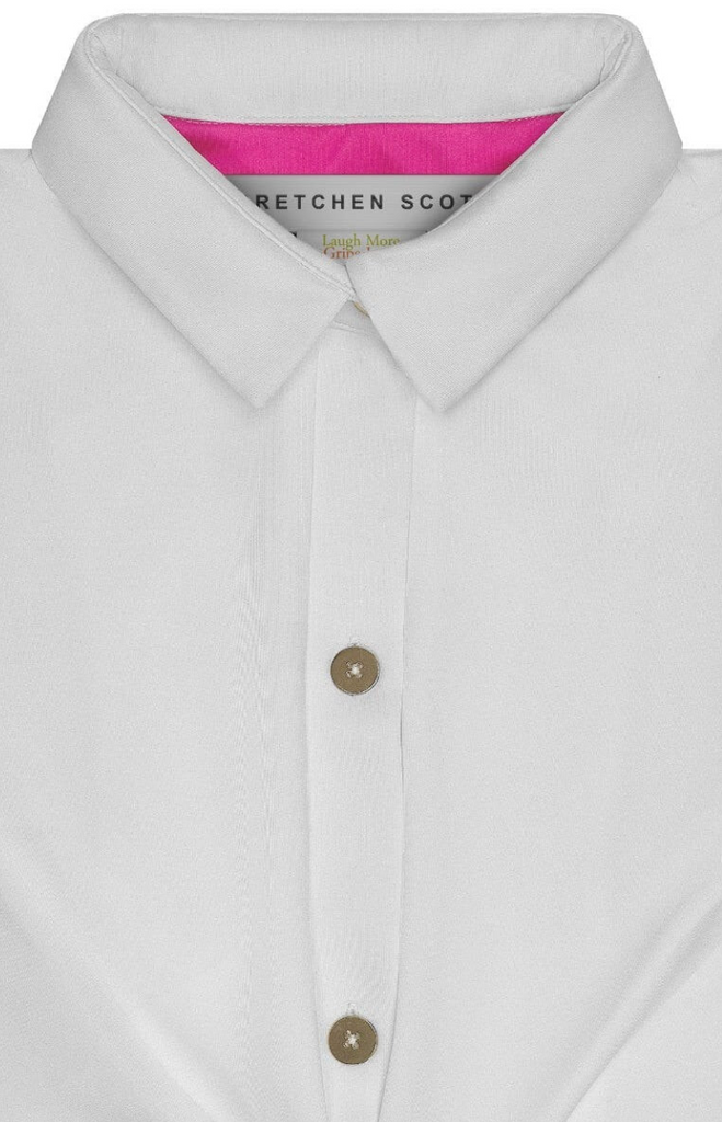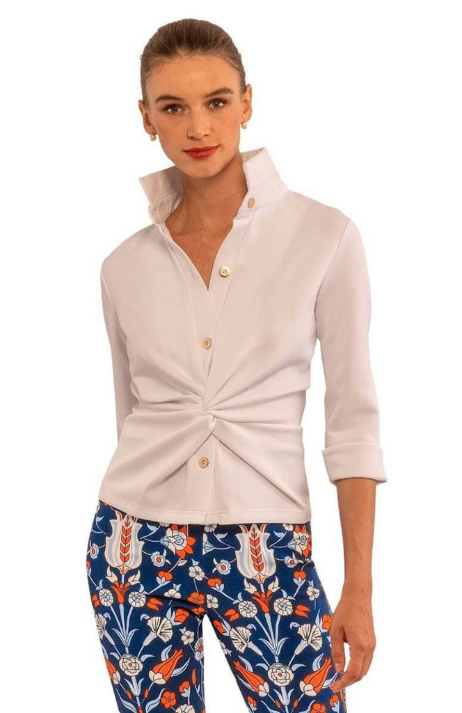 Effortlessly chic and tailored to flatter, this white twist-front button shirt is a standout piece for any occasion. The sculpted knot detail at the waist creates a cinched, feminine silhouette, while the structured collar and gold-tone buttons add a crisp, polished finish. Designed with ¾ sleeves and optional turn-back cuffs, it’s the perfect balance of comfort and sophistication.